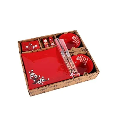 🌸CHERRY FLOWERS - Treat yourself to a party for two with this Asian-inspired meal box. Let yourself be transported to Asia for a meal, savoring delicious traditional Japanese dishes in the shade of cherry blossoms, also known as Sakura. This box with Japanese charm will delight lovers of Japanese cuisine. A unique gift idea for all Asian culture lovers. ✨ JAPANESE DECORATION - In a bright red, this set adopts a traditional Japanese pattern, embellished with ideograms. The cherry blossom patterns will immediately transport you to the enchanting atmosphere of Japan, in the shade of cherry blossoms. These original Asian tableware will add a touch of joy to your daily meals while playing a prominent decorative role. JAPANESE SUSHI SET - This lovely set includes 2 square plates (17 x 17 cm), 2 bowls of 11 cm diameter, 2 red porcelain sauce boats (8.5 x 5.5 cm), 2 pairs of chopsticks and 2 chopstick holders. This complete set brings together all the essentials for an authentic Japanese meal. Let yourself be transported to a total culinary immersion in Japanese gastronomy to delight your taste buds to the fullest! 🎁 ORIGINAL GIFT IDEA - This Japanese cherry blossom table set will be an original gift idea that will delight lovers of Japanese cuisine. A decorative item to offer for any occasion (Christmas, birthday, etc.) to please or cuddle yourself. ️ LIVE FROM ASIA - Chineuse is a French brand that deals with research and import of traditional Asian objects. Tea Service, Japanese Gardens, Jewelry, Figurines, Calligraphy, Zen Decorations... We are looking for the most beautiful gift and decoration ideas to enhance your interior and accompany your loved ones on a journey.