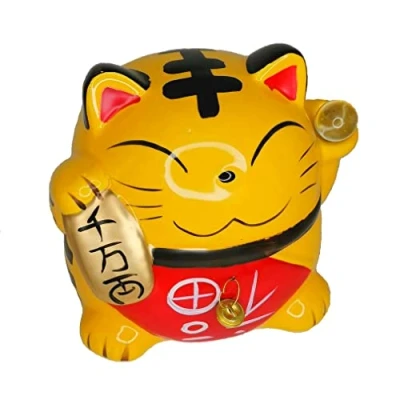 Maneki Neko statuette material: ceramic. Maneki Neko Statue Size: 15.5 x 18 x 14.5 cm. Maneki Neko statuette colour: dominant yellow. Japanese Lucky Charm Decoration This beautiful Maneki Neko, made of ceramic, is adorned with typical Asian decoration. It is adorned with a koban, a symbol of fortune and wealth and a beautiful ideogram. He also wears a crystal ball in his left paw, as to attract good luck and fortune.