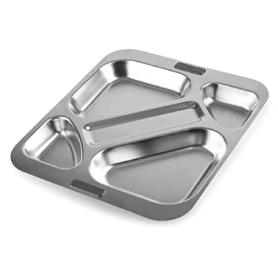 Amazon Self-service tray made of top quality 18/10 stainless steel. Satin finish and square shape with rounded edges. It has 4 compartments + space for cutlery and has two silicone handles. This 100% stackable tray is dishwasher safe. Dimensions: 32.5 x 37.5 x 3.8 cm.