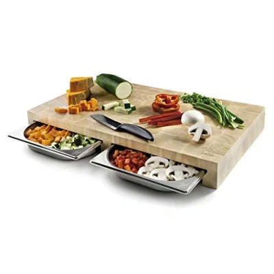 Rubber wood board and stainless steel tray Treated with a protective and antibacterial coating Non-slip feet provide stability Removable container (oven and dishwasher safe) Dimensions (container): 26.5 x 32.5 x 4 cm (2.5 L x 2) Total dimensions: 61.5 x 34 x 7 cm