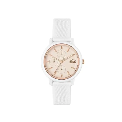 Multifunction Quartz movement with three subeyes Case thickness 10.75mm / Case Diameter 38mm Carnation gold dial White silicone strap with petit piqué pattern Water Resistance: 5ATM It may be worn while showering or swimming, but not scuba diving