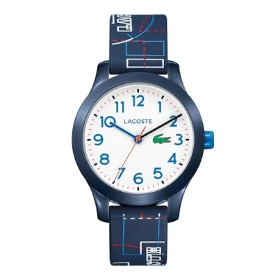3-hand Quartz Movement with large easy to read numbers Case thickness 9.6mm / Case Diameter 32mm White dial Navy blue silicone strap with printed design Water Resistance: 5ATM It may be worn while showering or swimming, but not scuba diving