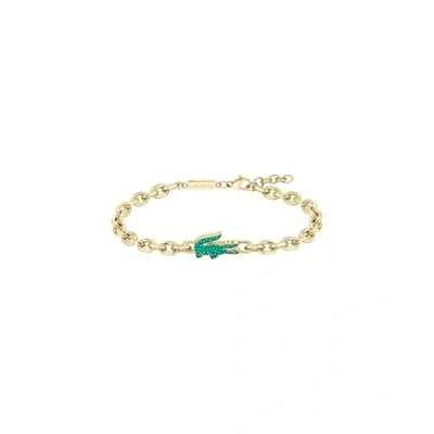 UNISEX BRACELET ARTHOR COLLECTION by Lacoste Jewelry – Timeless with an urban edge: a square rolo chain finished with the iconic crocodile, set with vibrant green crystals for a signature lift. POLISHED STAINLESS STEEL WITH YELLOW GOLD IP PLATING AND GREEN CRYSTALS; the Lacoste croc detail brings colour and character, keeping the look contemporary, versatile, and unmistakably iconic. MEASUREMENTS – A comfortable 175 mm fit, adjustable with a +25 mm extender. The iconic crocodile charm adds finesse with its 16.5 x 10.4 x 3 mm proportions. CONTEMPORARY ELEGANCE, MADE TO PLAY — Wear it solo for a clean accent, or stack it up for a bolder statement; an easy piece to style, and just as easy to gift. LOBSTER CLOSURE for a secure, comfortable fit.