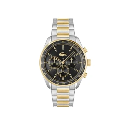 Precision chronograph movement: Elevate your timekeeping experience with the precision of a chronograph movement, allowing you to measure elapsed time with style and accuracy Case thickness 10.5mm - case diameter 42mm Dynamic black dial: immerse yourself in sophistication with a dynamic black dial, circularly brushed for a unique texture, the gloss-print crocodile at 12 o'clock proudly represents the iconic lacoste logo, adding a touch of elegance and brand heritage to your timepiece Two-tone stainless steel bracelet with yellow gold ion plating: elevate your wristwear with a meticulously crafted two-tone stainless steel bracelet, where the richness of yellow gold ion plating harmonizes with stainless steel, combining elegance and durability for a sophisticated wristwear experience Water resistance: 5atm - It may be worn while showering or swimming, but not scuba diving