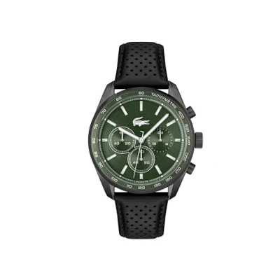 Precision Chronograph Movement: Elevate your timekeeping experience with the precision of a chronograph movement, allowing you to measure elapsed time with style and accuracy. Case thickness 10.5mm / Case Diameter 42mm Dynamic Green Dial: Immerse yourself in sophistication with a dynamic green dial, circularly brushed for a unique texture. The gloss-print crocodile at 12 o'clock proudly represents the iconic Lacoste logo, adding a touch of elegance and brand heritage to your timepiece. Sleek Black Perforated Leather Strap: Elevate your wristwear with a sleek black perforated leather strap, seamlessly blending style and comfort. The perforations add a sporty edge, making it an ideal companion for any occasion. Water Resistance: 5ATM It may be worn while showering or swimming, but not scuba diving