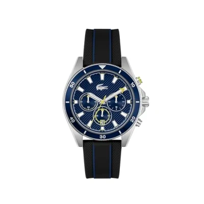 Sporty Chronograph with Nautical Influence: The Lacoste Mainsail men's watch is a sporty chronograph inspired by nautical aesthetics. Featuring a reliable quartz movement, it incorporates subtle color accents and delivers standout performance with a durable, modern design. Durable Case with Crown Protection: This robust 43mm stainless steel case with crown protection and two pushers ensures extra durability, while the hypoallergenic construction provides comfort for everyday wear. The navy blue aluminum coinage bezel adds a stylish, bold touch to this sports-inspired design. Distinctive Navy Blue Dial with Brand Detailing: The textured navy blue dial, complete with the iconic Lacoste crocodile at 12 o'clock, is accented by sunray sub-dials and colored hands for added flair, creating a distinctive look that embodies Lacoste’s legacy. Black Silicone Strap for a Sporty Look: The Mainsail with a black silicone strap provides exceptional comfort and a fresh, modern appearance. This durable and lightweight strap fits perfectly on the wrist, completing the sporty, dynamic design of the watch with a touch of minimalist elegance. Water Resistance: 5ATM It may be worn while showering or swimming, but not scuba diving