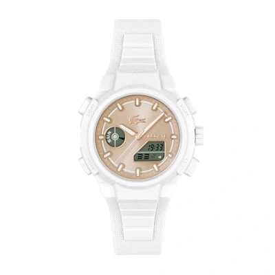 Hybrid Analog-Digital Movement The Lacoste LC33 watch features a unique hybrid analog-digital movement, combining classic timekeeping hands with advanced digital functions, including a world clock, stopwatch, and countdown timer. 40mm TR90 Case for a Bold Look Crafted from lightweight yet durable TR90, the 40mm case embodies the modern and daring aesthetic of the LC33 collection, showcasing Lacoste’s signature balance of style and functionality. Carnation Gold Satin-Finish Sunray Dial The sunray dial in elegant carnation gold reflects light beautifully, adding a refined touch to the bold and contemporary design. Integrated White Silicone Strap A smooth, integrated silicone strap in white ensures optimal comfort and complements the sleek, sporty character of this Lacoste ladies’ watch. Water Resistance: 10ATM Suitable for recreational activities like surfing, swimming, snorkeling, sailing, and water sports. Not recommended for scuba diving.