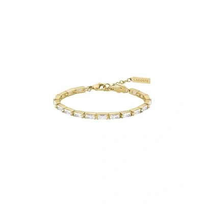 ELEGANT WOMEN’S TENNIS BRACELET – The Lacoste Duchess collection reimagines the classic tennis bracelet with modern baguette-cut crystals and feminine elegance. PREMIUM MATERIALS – Crafted in durable stainless steel with a luxurious yellow gold ion-plated finish and clear crystal embellishments. ADJUSTABLE SIZE FOR COMFORT – Bracelet length is 165 mm with a 25 mm extender chain for a flexible and comfortable fit. SPARKLING DESIGN – PERFECT FOR GIFTING – Featuring modern baguette-cut crystals, the Lacoste Duchess bracelet brings color and sparkle to the wrist. A miniature Lacoste crocodile tag at the closure adds an elegant finishing touch – ideal for gifting. LOBSTER CLASP CLOSURE – Secure and easy-to-use lobster clasp ensures the bracelet stays perfectly in place all day long.