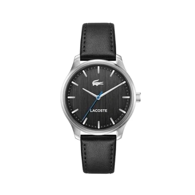3-HAND QUARTZ MOVEMENT – CLASSIC PRECISION – The Lacoste Lisbon features a minimalist three-hand layout for clean, accurate timekeeping with timeless appeal. 42MM STAINLESS STEEL CASE – CLASSIC WITH A MODERN EDGE – The polished steel case offers durability and understated refinement for daily wear. BLACK DIAL WITH VERTICAL BRUSHING AND STICK INDEXES – A vertically brushed black dial features applied stick markers, a minute track, and a bold blue second hand. BLACK LEATHER STRAP – REFINED AND COMFORTABLE – The stitched leather strap offers a traditional touch with a modern fit, ideal for versatile styling. 5 ATM WATER RESISTANT – ELEGANCE MADE FOR EVERYDAY – With splash resistance and elevated design, Lisbon is a dependable companion from weekday to weekend.