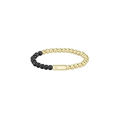 Beaded Bracelet for men by LacosteMaterial: Stainless Steel with yellow Gold Ion Plating (IP) and onyx stone Inner circumference: 18 cm Embellished with etched Lacoste logo on the closure Closure: Magnetic