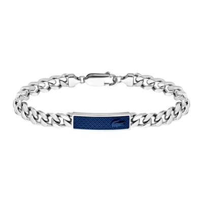 Curb Chain Bracelet for men by LacosteMaterial: Stainless steel chain and navy blue silicone details Inner circumference: 19 cm Embellished with petit piqué pattern Closure: Lobster Claw Clasp