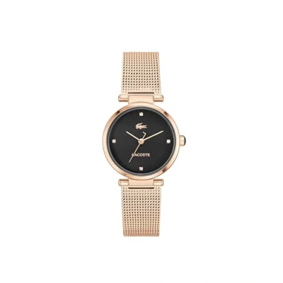 3-hand quartz movement for her - The Lacoste orba features a refined three-hand display for everyday precision in an elegant, minimalist design 30mm carnation gold ip case - A polished 30 mm case in warm carnation gold-tone stainless steel adds a soft, modern glow to the look Black dial with crystal indexes - the enamel-finish black dial features four squared crystal markers, a gold-tone lacoste crocodile at 12, and an l-shaped second hand Carnation gold ip mesh bracelet - Refined and flexible - The polished mesh bracelet in warm carnation gold IP offers modern elegance with a soft, wrist-hugging feel 5 atm water resistant - Made for everyday moments - Splash-resistant and stylish, The Lacoste orba is the excellent women's watch for casual elegance and gifting