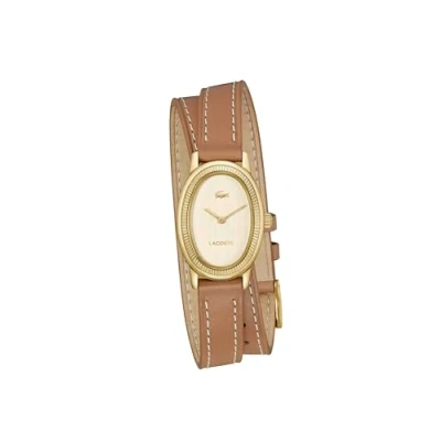 2-HAND QUARTZ MOVEMENT – The Lacoste Parisienne women’s watch features a slim 2-hand quartz movement, blending timeless style with everyday precision. OVAL STAINLESS STEEL CASE – With a 30x22 mm polished stainless steel case and signature fluted bezel, the Parisienne collection stands out for its chic, feminine silhouette. VERTICAL BRUSHED GOLD DIAL – The yellow gold-toned dial features a refined vertical brushed finish and a golden Lacoste crocodile at 12 o’clock. DOUBLE WRAP LEATHER STRAP – Smooth tan leather strap with a stylish double wrap design, offering comfort and a modern feminine twist. 5 ATM WATER RESISTANT – Water resistant to 5 ATM: this women’s watch resists splashes and rain, but is not suitable for showering or swimming. Perfect for gifting.
