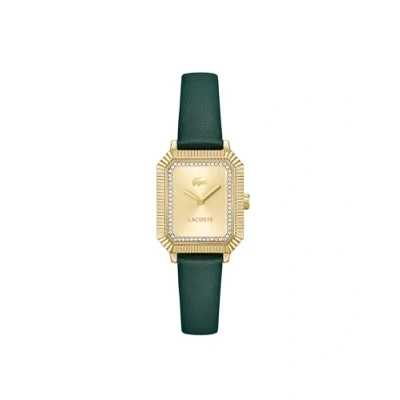 TWO-HAND QUARTZ MOVEMENT – Elegant and minimalist, this two-hand watch offers precise timekeeping with timeless simplicity. 28.3 X 20.7 MM STAINLESS STEEL CASE – Featuring a polished hexagonal case with a slim profile for a sleek, feminine look. GOLD SUNRAY DIAL WITH CRYSTAL PAVÉ & PLISSÉ BEZEL – The Lacoste Parisienne shines with a gold sunray dial, crystal pavé detailing, a gold-tone crocodile at 12 o’clock, and a pleated bezel inspired by the iconic tennis skirt. GREEN LEATHER STRAP – A refined green leather strap adds contrast and elegance with a soft, feminine finish. 3 ATM WATER RESISTANT – A TIMELESS GIFT FOR HER – Splash-resistant and refined, this women’s watch is a perfect gift for birthdays, anniversaries, or special moments.