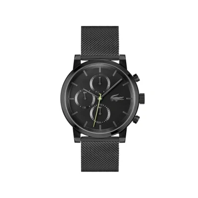 MULTIFUNCTION QUARTZ MOVEMENT FOR MEN – The Lacoste Replay features a clean multifunction layout with three vertically positioned sub-dials and sporty pushers for a dynamic look. 44MM STAINLESS STEEL CASE WITH POLISHED BEZEL – A bold 44 mm case in stainless steel with a polished bezel combines strength and sleek urban design. BLACK DIAL WITH CIRCULAR BRUSHING AND STAMPED INDEXES – A sleek black dial with circular brushed texture, stamped indexes, and Lacoste crocodile at 3 o’clock for stealth appeal. BLACK IP STAINLESS STEEL MESH BRACELET – MONOCHROME AND MODERN – The mesh bracelet in black ion-plated stainless steel adds texture, durability, and a streamlined finish. 5 ATM WATER RESISTANT – BUILT FOR URBAN LIVING – Splash-proof and reliable, the Lacoste Replay is made to move with you through everyday style and activity.