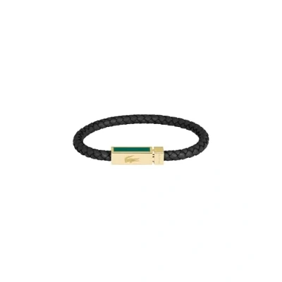 MEN’S BRACELET ROKEL COLLECTION by Lacoste Jewelry – A single round-braided black leather bracelet, clean yet with character: classic elegance that works every day. BLACK BRAIDED LEATHER AND STAINLESS STEEL; rectangular element with yellow gold IP finish and green enamel fill, signed with the iconic etched crocodile and Lacoste branding. CHAIN 190 mm - BRANDING RECTANGULAR ELEMENT 26 x 8 mm CLASSIC ELEGANCE — The texture of the leather and the touch of colour create a refined signature: made to keep for yourself, and just as beautiful to gift. SQUARE MAGNETIC CLOSURE for a secure, clean closure, effortlessly.