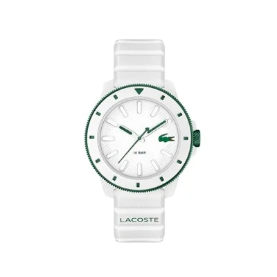 3-HAND QUARTZ MOVEMENT FOR MEN – The Lacoste.12.12 Scuba offers precise timekeeping with a streamlined three-hand design inspired by diver-style watches. 43MM TR90 CASE WITH ALUMINIUM BEZEL – A lightweight 43 mm TR90 case with a matte aluminium bezel delivers the sporty edge of the Lacoste.12.12 Scuba collection. WHITE DIAL WITH LUMINESCENT INDEXES – A crisp white dial with luminous markers and the Lacoste crocodile at 3 o’clock for fresh, standout visibility. WHITE SILICONE STRAP – SPORTY AND CLEAN – The textured white silicone strap combines durability and comfort in a bold, athletic design. 10 ATM WATER RESISTANT – A bold Lacoste men’s watch designed for swimming, snorkeling, and surface water sports.