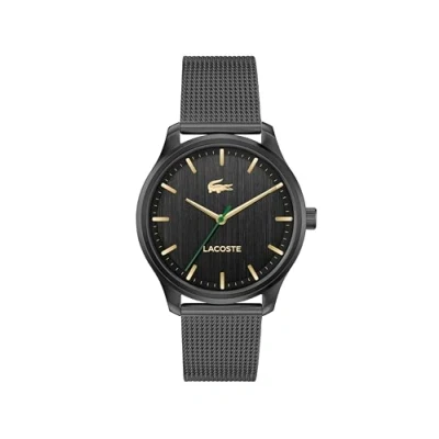 3-HAND QUARTZ MOVEMENT – CLASSIC PRECISION – The Lacoste Lisbon features a minimalist three-hand layout for clean, accurate timekeeping with timeless appeal. 42MM BLACK IP CASE – MODERN AND ELEGANT – The stainless steel case is coated in black ion plating for a refined, contemporary finish. BLACK DIAL WITH VERTICAL BRUSHING AND GOLD DETAILS – A vertically brushed black dial features gold-tone stick indexes and Lacoste branding with a contrasting green second hand. BLACK IP STAINLESS STEEL MESH BRACELET – MINIMAL AND STYLISH – The mesh bracelet in black IP stainless steel offers a sleek silhouette and comfortable, everyday wear.
