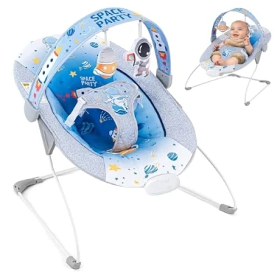 Multi-Functional Baby Seat: Designed for infants aged 0-6 months, this baby seat accommodates a weight range of 6-20 pounds, providing support for your newborn. Simply install batteries to activate the gentle vibration mode that helps relax your baby. (Note: Batteries not included.) Portable Infant Seat: Perfect for use at home or while out, such as during picnics or family gatherings, this lightweight and baby seat is easy to carry and store. It offers a cozy and steady seating area, creating a pleasant space for your baby, whether indoors or outdoors. Space-Themed Fun:This Infant Bouncer features adorable toy dolls that not only capture your baby's attention but also aid in visual and tactile development. The soft seat adds extra comfort for your little one. Soothing and Secure Baby Seat: With a built-in music feature, this seat plays gentle tunes to provide entertainment. The comfortable design and secure strap help keep your baby content and protected. Stylish and Comfortable: Carefully crafted with your baby’s comfort in mind, this baby seat also features a stylish look. The bright, colorful pattern adds a fun and cheerful touch. Its esign allows for easy storage and transport.