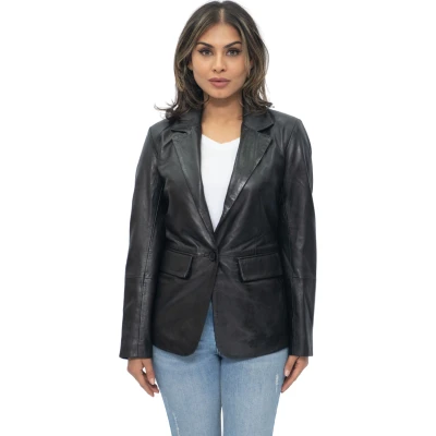 Elevate your style with our Women's Leather Blazer Jacket. Crafted from soft and supple lambs nappa leather, this jacket offers a luxurious and comfortable feel. It features two exterior waist pockets for a touch of functionality and added style. Available in two stunning colours, this jacket allows you to express your personal taste. The collar showcases notched lapels, adding a sophisticated touch to the overall design. With a one-button closure, this blazer-style jacket exudes elegance and versatility. Whether you're heading to the office or going out for a night on the town, our women's leather blazer jacket is the perfect choice. • Soft and supple lambs nappa leather construction • Two exterior waist pockets for a touch of functionality • Available in two stunning colours • Notched lapels on the collar for a sophisticated look • One-button closure for elegance and versatility.