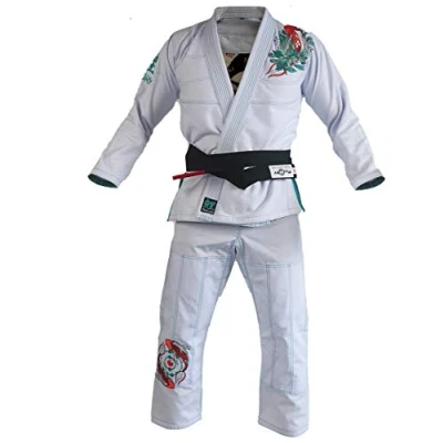 QUALITY PROMISEFLUORY Sports Goods Factory is a professional manufacturer of Brazilian Jujitsu kimonos, Karate Uniforms, Tae Kwon Do Uniforms, Kung Fu Uniforms, Judo Uniforms, Kendo Uniforms, Muay Thai Shorts, Boxing Shorts, Ninja Uniforms and other martial art related products.We believe good quality and service are the best ways to support the long-term operation. MATERIALThe Light weight gi feels cooler and light. Ideal for all types of training.No shrinking- made from pre-shrunk fabric .EVA Foam Collar.Slim Cut 100% Cotton Rip Stop Pants with round Add some reinforced areas to the Elements, such as 3 rows of reinforced cuff lining, making it harder for your opponent to keep a solid grip, whilst providing amazing strength and 3 rows of ankle cuff lining increases the durability of the leg opening, whilst helping the pants maintain their tapered shape.One piece construction with no back seam, Reinforced stitching for strength and durability The Female Pearl Weave Gi is a cut designed specifically for Female.Embroidery on Sleeves,Jacket,and Pants CONTENT ONE SET BJJ GI. PLEASE NOTE THAT THE GI (DOES NOT COME WITH BELT)