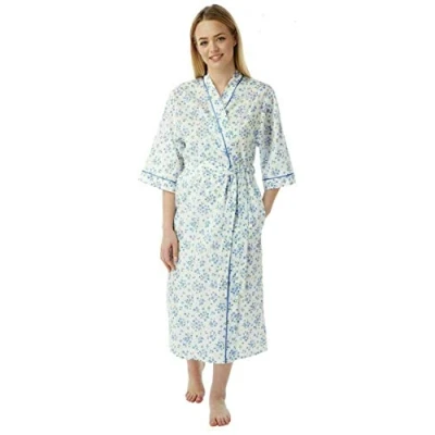 Ladies Dressing Gowns Lightweight : This comfortable summer dressing gown is made of 80% Polyester, 20% Cotton blend, providing a soft, smooth and lightweight feel for ultimate relaxation. Available in UK sizes 10-30. Vibrant Floral Print : Our ladies dressing gowns feature a beautiful floral print in shades of pink, blue, and lilac, creating a perfect blend of style and comfort. The short sleeves make it an ideal summer dressing gown for women in the UK. Practical Design: These womens dressing gowns have a relaxed fit with a wrap around style and a tie belt. The robe also includes two side pockets, adding convenience to this stylish cotton dressing gown. Versatile Use: This cotton dressing gowns for women uk can be used as a towel robe, perfect after a bath or shower. It's not just a bathrobe for women, but also great as loungewear, a house coat, or even as a hospital gown. Plus Size Available: Our dressing gown womens range includes plus sizes, ensuring everyone can enjoy the comfort of our cotton dressing gowns for women UK. Experience the luxury of a lightweight dressing gown women adore.