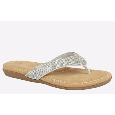 Cipriata present their Alcee flip flops, crafted with a silver textile upper and adorned with diamante accents for extra elegance. They feature a textile lining and padded PU sock for optimal comfort, whilst the PU sole offers exceptional durability. - Textile upper - Padded sock - Slip on design for easy on/off wear - Dimante detailing - PU outsole