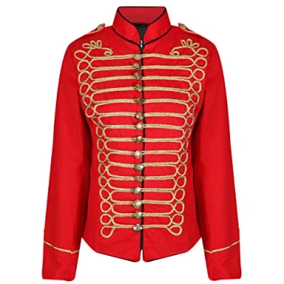 ALL-SEASON MUST-HAVE: Step up your style game with our Steampunk Napoleon Military Drummer Parade Jacket for women! The jacket is a nod to old military-inspired uniforms and is just what you need to add a touch of fashion to your look. Suitable for all events and seasons, this military jacket is a must-have for any fashion-forward wardrobe! PERFECT FOR ALL OCCASIONS: Perfect for themed parties, Halloween, Cosplay shows, costume events, colonial steampunk-themed rock parties, Comic Con, nightclubs, weddings, Renaissance events, photo shoots, and more. Our women’s jackets are guaranteed to add a fashionable touch to your look and elevate your style. COMFORTABLE AND SOPHISTICATED: Experience ultimate comfort with our military style parade jacket! It is made of 100% cotton with a polyester lining, a stylish band collar, and long sleeves. The gold detailing and metal buttons add a touch of elegance to this already perfect piece. DISCOVER YOUR PERFECT FIT IN STYLE: Our jacket is designed for every woman, with sizes ranging from S (UK 8 / US 4) to 4XL (UK 20 / US 16). No more settling for ill-fitting, uncomfortable jackets. Upgrade your wardrobe and embrace comfort and style like never before. QUALITY GUARANTEED: Discover a new level of confidence in your shopping experience! Our commitment to quality and comfort is guaranteed, and we offer swift after-sales support to ensure your satisfaction.