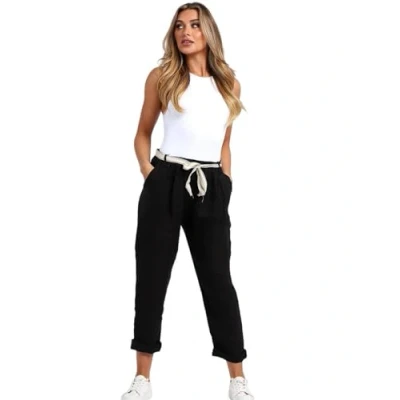 Ladies Italian Plain Linen Trousers Side Pockets Belt Elastic Waist Turn Up Hem Crop Pant (One Size 8 16, Black)