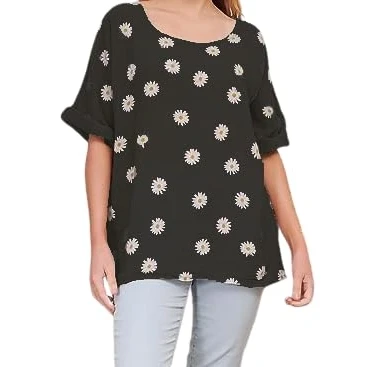 Ladies Italian Quirk Lagenlook daisy print Linen Mix Lightweight Cotton top Round Neck 3/4 Sleeves Casual Tunic crop One Size UK (10 20) Black