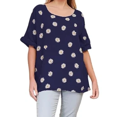 Ladies Italian Quirk Lagenlook daisy print Linen Mix Lightweight Cotton top Round Neck 3/4 Sleeves Casual Tunic crop One Size UK (10 20) Navy