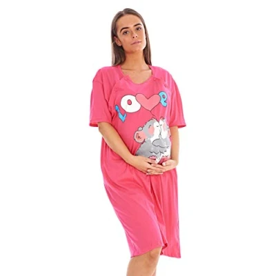 Ladies Maternity Nursing Nightdress 100% Cotton Motif Print Breast Buttons Labor Fuchsia