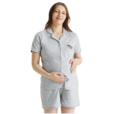 This is a gorgeous ladies maternity shorty pyjama set. Exclusive to ourselves. the design and style are perfect for any mom to be, or after baby is born. The maternity grey pyjamas come with a lovely short sleeved top, detailed with a delicate black beading trim, and button through front fastening. The pyjamas have matching short pyjama bottoms with an adjustable fastening tie for comfort when baby is growing. The maternity pjs feature an adorable slogan to the front " Mum to be ". The maternity 2 piece pyjama set is made from soft cotton rich material and is perfect for keeping you cool in the hotter months, and ideal for layering in the colder months. The maternity pyjama top has a slightly dipped front, and is designed with button opening to the front, helping with breastfeeding times or ease of dressing. The ladies maternity pyjamas are an essential for moms to be in the later months, and also for packing in the hospital bag. Perfect gift too for any moms to be. Ladies Sizes: Small (8-10), Medium (12-14), Large (16-18), X Large (20-22). See picture for Size Guide.