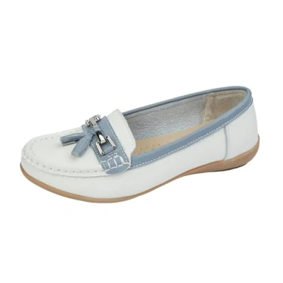 Ladies Nautical Wide FIT Leather Smart Loafer Tassel Moccasin Flat Slip On Comfort Shoe Size 3 8 (White/Baby Blue, UK Footwear System, Adult, Women, Numeric, Wide, 7)