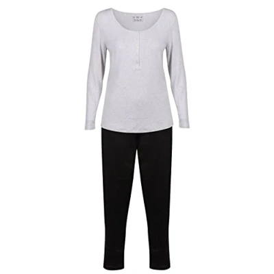 Ex UK Store - Ladies Pyjama Sets - RRP £19. Grey ribbed long sleeve top with stretch & button fasten neck. Black bottoms with elasticated waistband & functional draw ribbon Available in UK Sizes 8/10, 12/14, 16/18, 20/22. EX UK STORE - Specialists in Ex Chain Store Clothing made for Stores based within the UK Brand New Item. Store branding will be removed, cut off or blacked out to comply with the law of re sale.