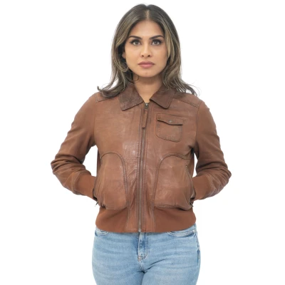 Ladies Tan Brown Leather MA 1 Varsity Bomber Jacket M