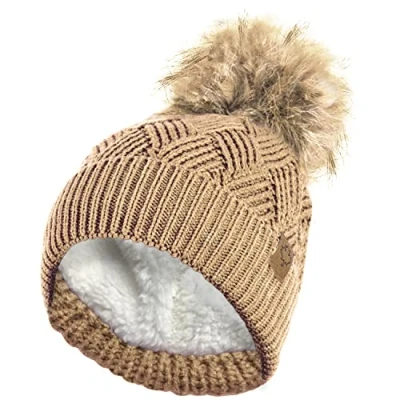 Ladies Warm Chunky Diamond Cable Knit Hat with Thermal Teddy Fleece Lining and Detachable Faux Fur Pompom Camel