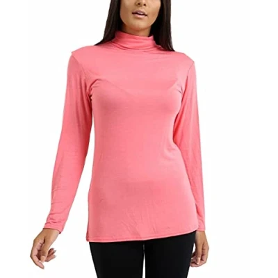 Ladies Women Basic Long Sleeve Plain Polo Turtle Neck Stretch Plus Size Top T Shirt (Coral, ML)