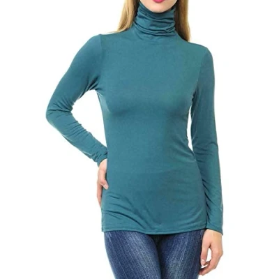 Ladies Women Basic Long Sleeve Plain Polo Turtle Neck Stretch Plus Size Top T Shirt (Teal, SM)