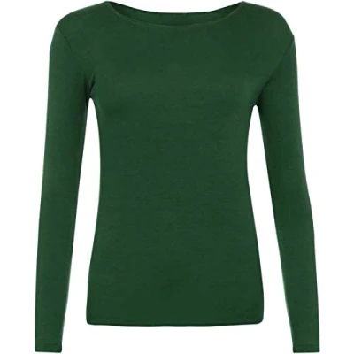 Ladies Women Basic Long Sleeve Plain Round Neck Stretch Plus Size Top T Shirt (Bottle Green, XXL)