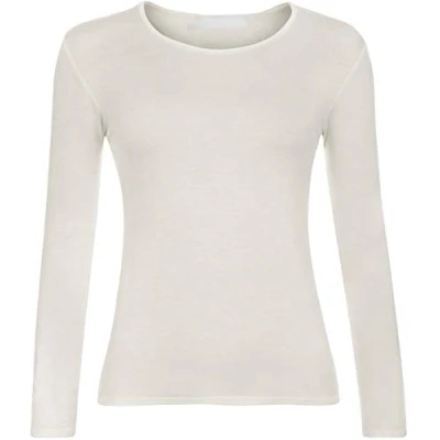 Ladies Women Basic Long Sleeve Plain Round Neck Stretch Plus Size Top T Shirt (Cream, SM)