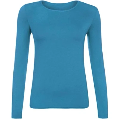 Ladies Women Basic Long Sleeve Plain Round Neck Stretch Plus Size Top T Shirt (Turquoise, XL)