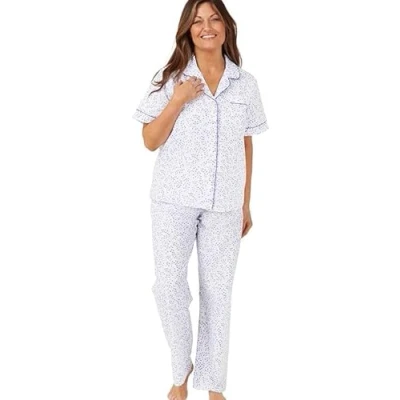 Soft, cool and breathable in pure Poly cotton, our best selling pyjama set has been updated this season with a floral print in delicate blue pink and lilac print. We've kept the shape and cut classic with a short sleeve detailed with piping along the collar, sleeves and front, Colours available: Pink , Lilac and Blue Sizes available ; 10-12 , 12-14, 16-18, 20-22, 24-26, 28-30