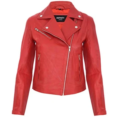 Ladies Womens Red Real Leather Fitted Vintage Biker Style Zip Fashion Jacket S