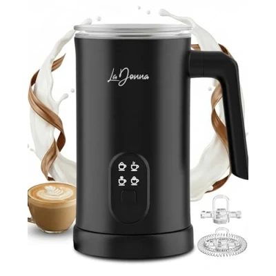 Amazon 4-FUNCTION CONTROL PANEL: Easily craft your favorite café drinks with four dedicated modes: Hot Froth, Heat Milk, Cold Froth, and Hot Chocolate. This all-in-one electric milk frother and steamer lets you enjoy lattes, cappuccinos, iced coffees, and rich hot chocolate with a single touch. ENHANCED FOAM TECHNOLOGY: Built with magnetic centrifugation, this hot chocolate maker delivers smooth, velvety foam every time—creating dense cold foam in 70–180 seconds and uniform hot foam in 90–180 seconds. Experience quiet, efficient, and consistent frothing for all your beverages. PREMIUM, FOOD-GRADE MATERIALS: Crafted with food-grade high-temperature PP, food-grade PC, silicone components, and a 304 stainless steel inner tank, this milk heater ensures durability and safe heating. It automatically stops at the ideal temperature to prevent overheating and deliver perfect results every use. EASY-CLEAN NON-STICK INTERIOR: Designed for effortless upkeep, the non-stick inner tank and detachable base make cleaning quick and hassle-free. Whether you’re frothing milk or preparing hot chocolate, maintenance is simple and convenient for everyday use. SPILL-FREE & USER-FRIENDLY DESIGN: Includes a spill-proof lid, non-slip base, and a compact body measuring 109 × 159 × 195 mm. With 160 ml max frothing capacity and 350 ml heating capacity, this electric frother provides safe, stable, and mess-free operation—perfect for at-home baristas.