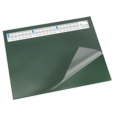 Desk pad with transparent film and replaceable 3-year calendar, for excellent writing comfort, 40 x 53 cm, colour: green Anti-glare full view film over the whole format and replaceable 3-year calendar Particularly fine-pored artificial foam coating on the back provides high slip resistance and protects the desk surface The Läufer 3-layer construction ensures absolute flatness even with large temperature fluctuations Hard-wearing and durable