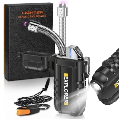 Amazon Marketplace 360° Rotatable & Stretchable Arc Hose: Designed with one 360° flexible and retractable high-quality heat-resistant hose. Long neck keep you away from the flame, and retractability making it more convenient to store and carry than other long candle lighters. Perfect for outdoor adventure and daily use at home. USB C Rechargeable: Upgraded with a type C charger for faster and more stable charging. Also you can also check the power usage and charging progress at any time through the LED battery display. 3 Modes of Flashlight: Equipped with 3 modes of flashight, strong and low light can meet the lighting needs of different environments, and the strobe mode can be used to signal for help when you are lost or in danger outdoors. Waterproof and Windproof: This lighter is a plasma arc lighter with a rubber sealing ring and locking buckle. It is waterproof and windproof,and can be used normally in extreme weather such as rainy days and storms. Upgraded Lanyard: This lighter has upgraded the lanyard. The extra-long lanyard can be hung around the neck or backpack during outdoor adventures such as climbing, hiking and fishing. It is not easy to fall off. Blowing the matching emergency whistle allows companions to know your location and avoid losing contact in the wild.