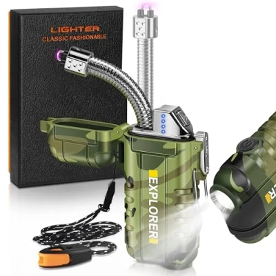Amazon Marketplace 360° Rotatable & Stretchable Arc Hose: Designed with one 360° flexible and retractable high-quality heat-resistant hose. Long neck keep you away from the flame, and retractability making it more convenient to store and carry than other long candle lighters. Perfect for outdoor adventure and daily use at home. USB C Rechargeable: Upgraded with a type C charger for faster and more stable charging. Also you can also check the power usage and charging progress at any time through the LED battery display. 3 Modes of Flashlight: Equipped with 3 modes of flashight, strong and low light can meet the lighting needs of different environments, and the strobe mode can be used to signal for help when you are lost or in danger outdoors. Waterproof and Windproof: This lighter is a plasma arc lighter with a rubber sealing ring and locking buckle. It is waterproof and windproof,and can be used normally in extreme weather such as rainy days and storms. Upgraded Lanyard: This lighter has upgraded the lanyard. The extra-long lanyard can be hung around the neck or backpack during outdoor adventures such as climbing, hiking and fishing. It is not easy to fall off. Blowing the matching emergency whistle allows companions to know your location and avoid losing contact in the wild.