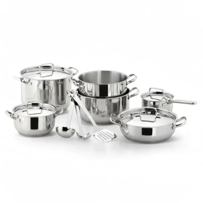 AmazonCookware set: Lagostina 13-piece cookware set consisting of: pot 2 handles Ø 18 and 22 cm, deep saucepan 2 handles Ø 18 and 22 cm, low saucepan 2 handles Ø 24 cm, deep saucepan with long handle diameter 14 cm, lids Ø 14, 18, 22 and 24 cm, ladle, pole. , , a prendispaghetti BATTERY STAINLESS STEEL POTS: The Sfiziosa cookware set is made of high quality 18/10 stainless steel, durable and 100% hygienic, with modern and elegant finishes For induction, gas and oven: Lagoseal Plus thick aluminium base enclosed between two layers of steel allows heat to spread quickly and evenly; it is suitable for all hobs, including induction, and oven safe up to 250°C WIDE HANDLES: The pans in the Sfiziosa set feature wide welded handles in a professional design for a secure grip when cooking or serving at the table FEATURES: Elegant exterior mirror polish easy to clean and internal satin finish. Dishwasher safe. Guaranteed 10 years