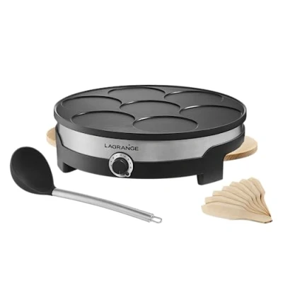 EASY TO USE - Powerful (1500W), adjustable thermostat, large 35cm diameter cast aluminum plate with 7 mini pancakes with 11cm diameter and smart accessories. Easy to carry: built-in wooden handles Adjustable thermostat: 5 thermostat positions to adjust the temperature of the plate or keep warm. Accessories included: the essential accessories to make pancakes successful: a large ladle and 7 small spatulas. Easy to clean: removable plate with non-stick coating., Weight: 7.9807338844 pounds, Manufacturer: LAGRANGE